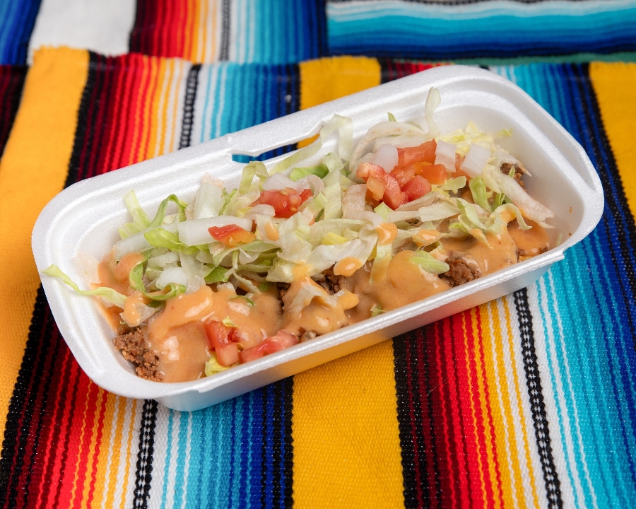 Beans, meat, and queso, topped with onions and black olives. Served with a bag of chips