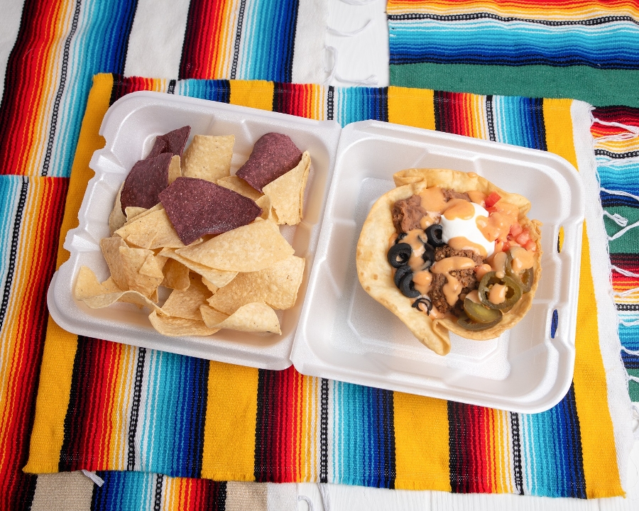 Beans, beef, queso, sour cream, tomato, onion, black olives, and jalapeno. Served in a taco bowl, with chips